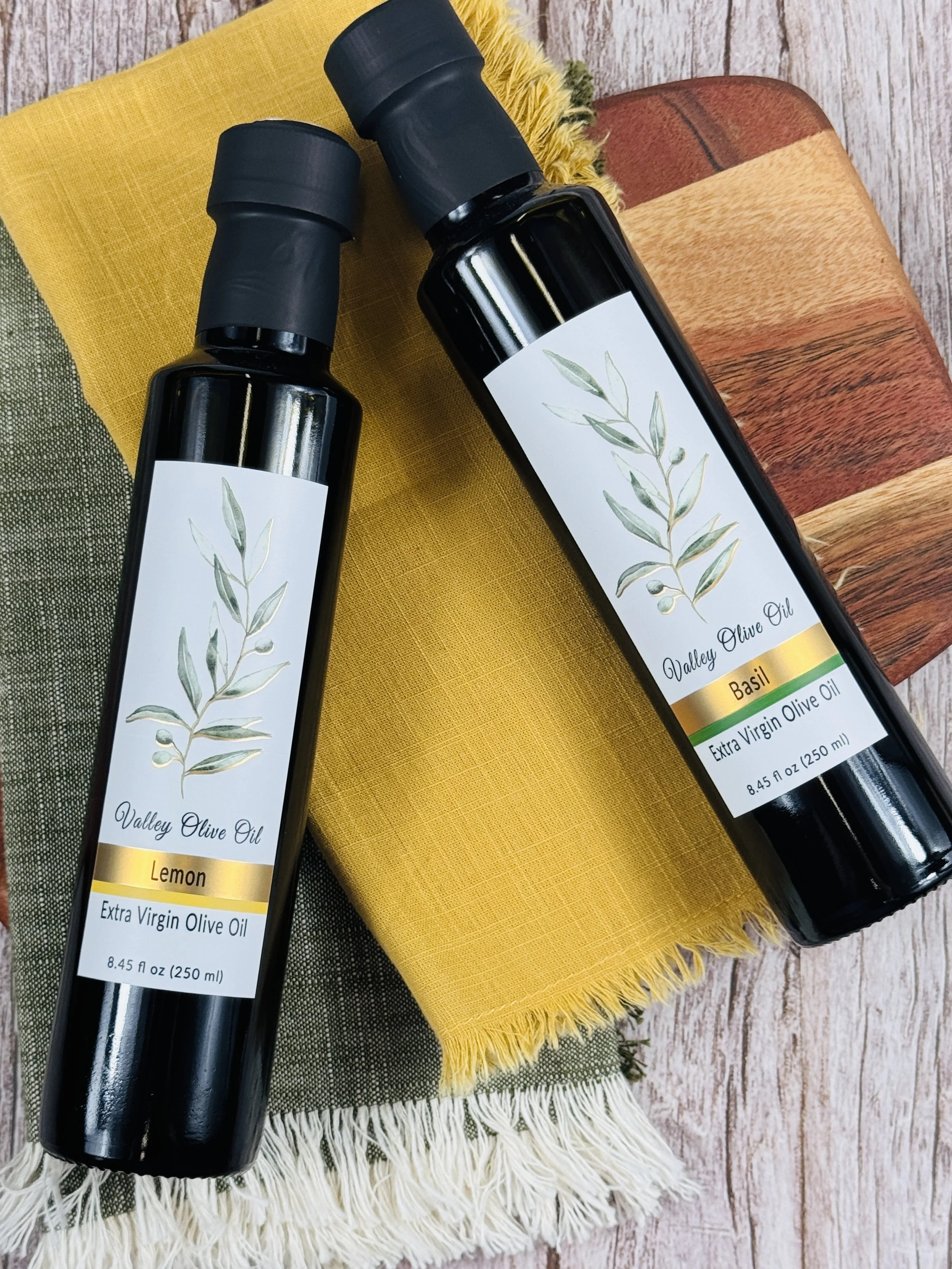 Discover the perfect duo with our 2-pack set featuring 250ml bottles of Zesty Lemon Infused Olive Oil and Aromatic Basil Infused Extra Virgin Olive Oil, both beautifully presented in elegant Dorica bottles. Made with natural flavors, these premium oils are crafted by crushing fresh lemons and basil with olives harvested at their peak, delivering bright citrus and savory herb notes. This versatile set is ideal for enhancing salads, pasta, seafood, and more, bringing a gourmet touch to everyday meals. Whether you're gifting or stocking your kitchen, this flavorful pair offers a delightful culinary experience.